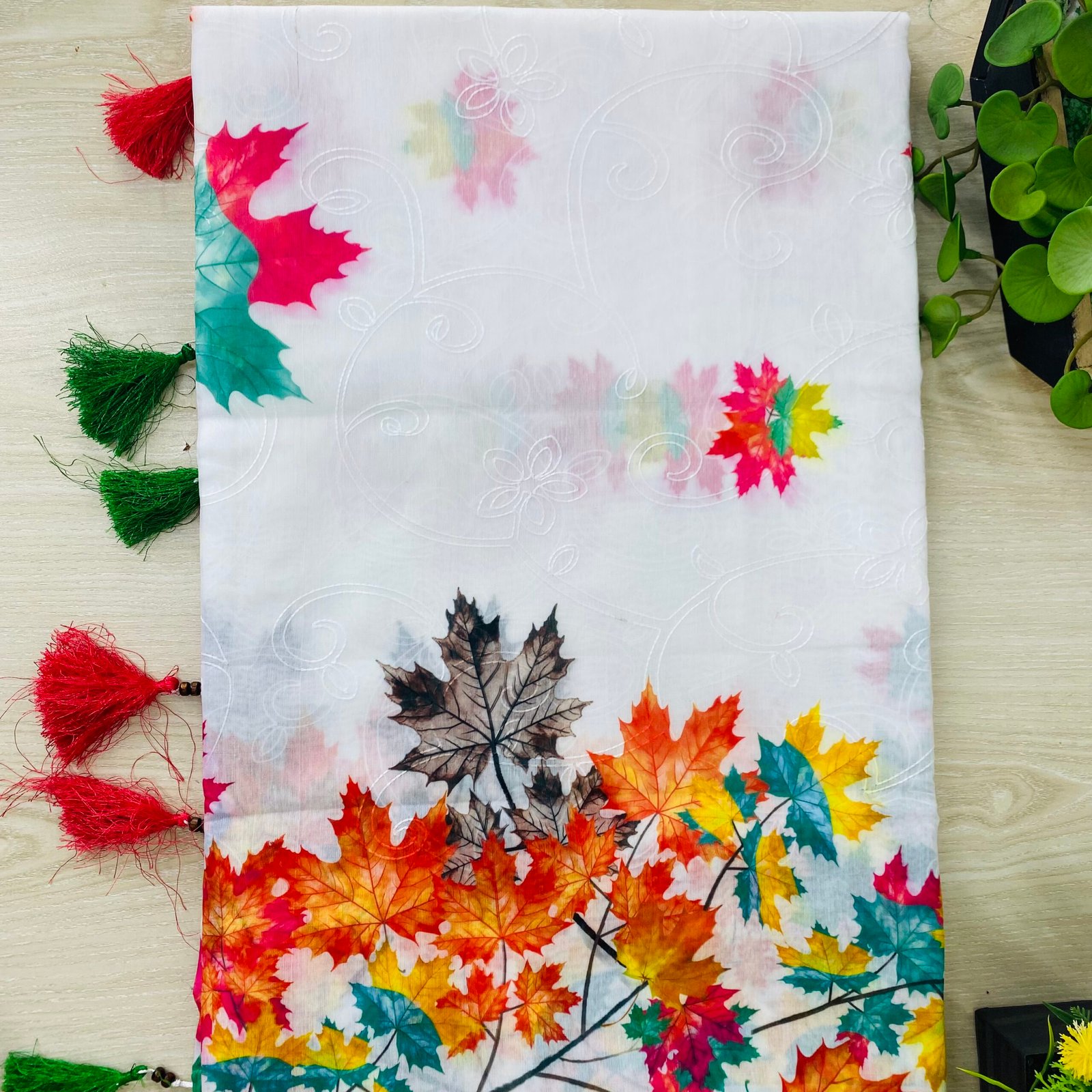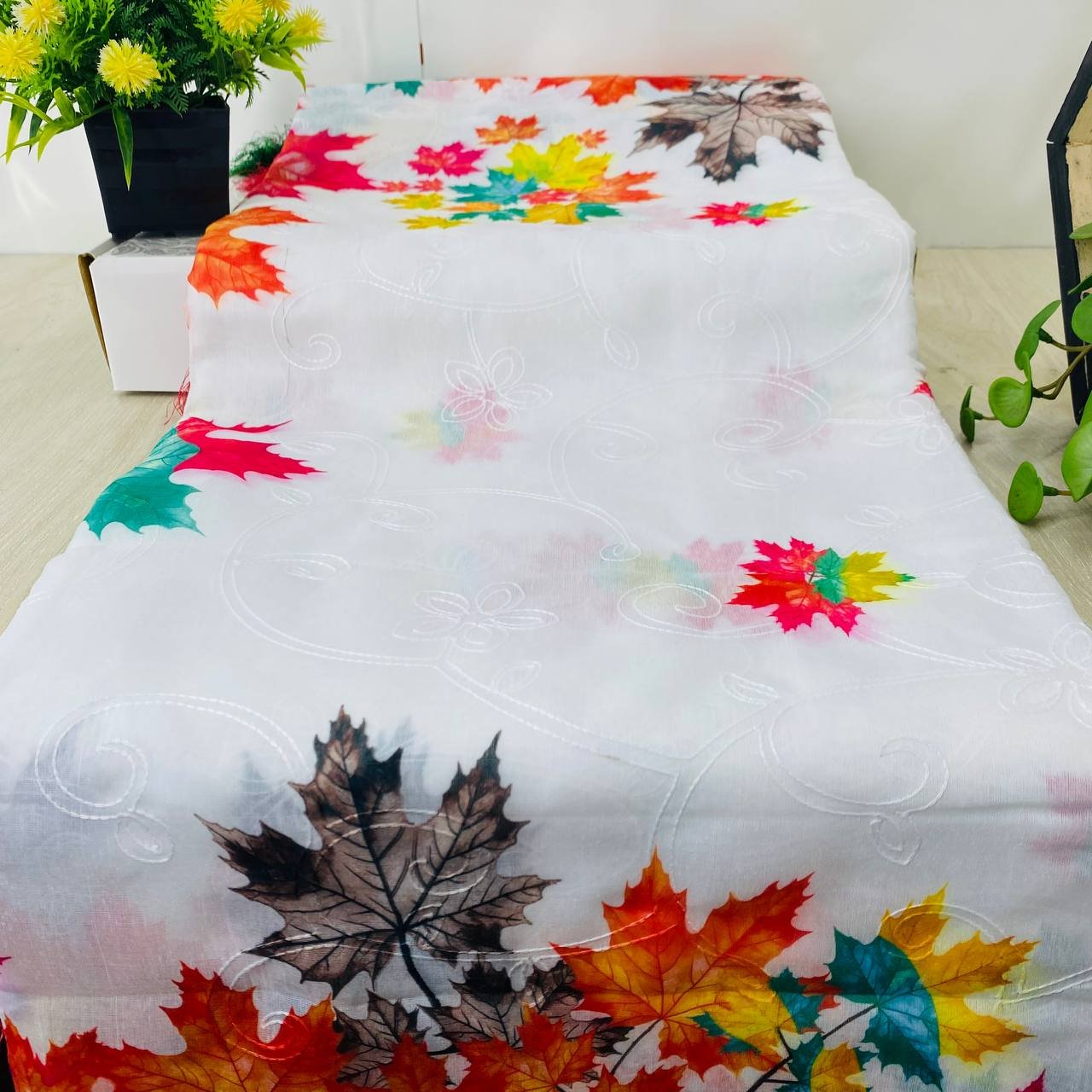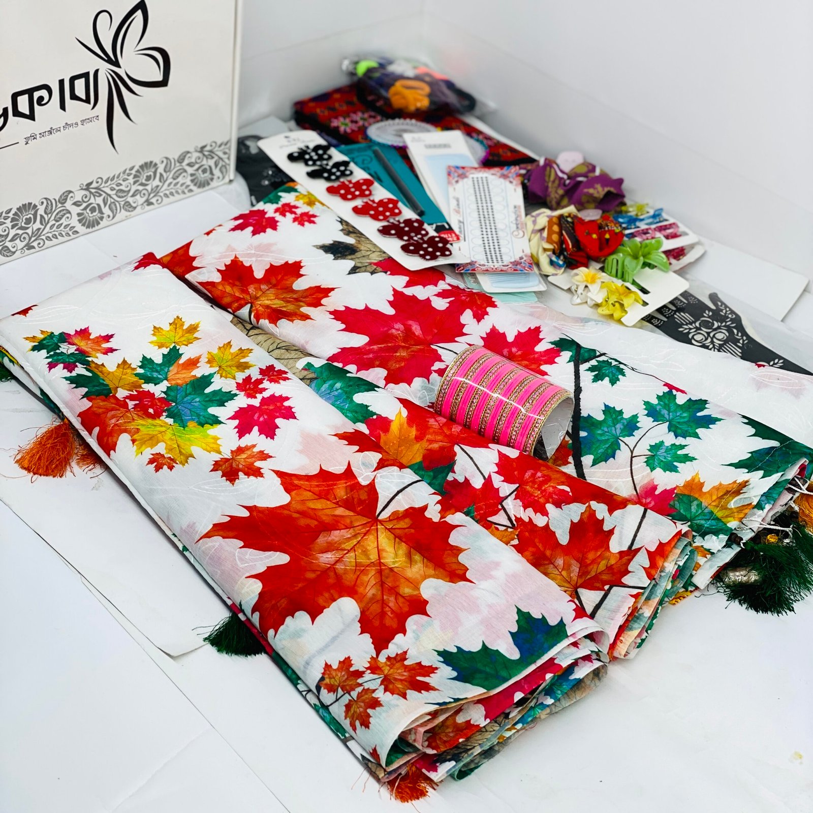 রঙিন ম্যাপল পাতায় ভরপুর!" শীতকালীন পাতার মতোই কোমল, উজ্জ্বল, আর অনন্য এই শাড়ির রঙ ও নকশা।